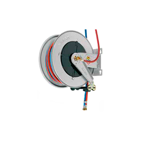 Раздаточная катушка для подачи сварочных газов. Спаренные шланги для двух газов по стандарту EN559 из резины SBR/EPDM. Арматура и шарнир из латуни. Прокладки ВАЙТОН. Шланги: 30 метров 2х1/4” – 2х6. Вход: F3/8”G, Выход: F3/8”G.