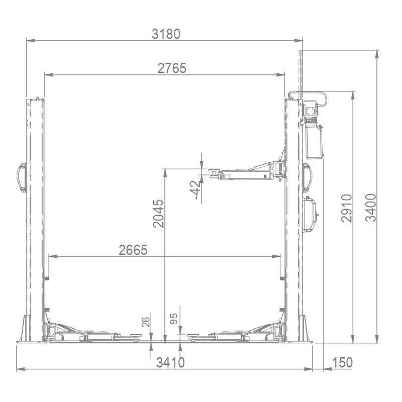 Подъёмник оснащён устройствами безопасности для защиты от падения груза, защитой от перегрузки гидравлической системы, устройствами для блокировки поворота подъемных лап и системой синхронизации стальными тросами подъемных кареток.