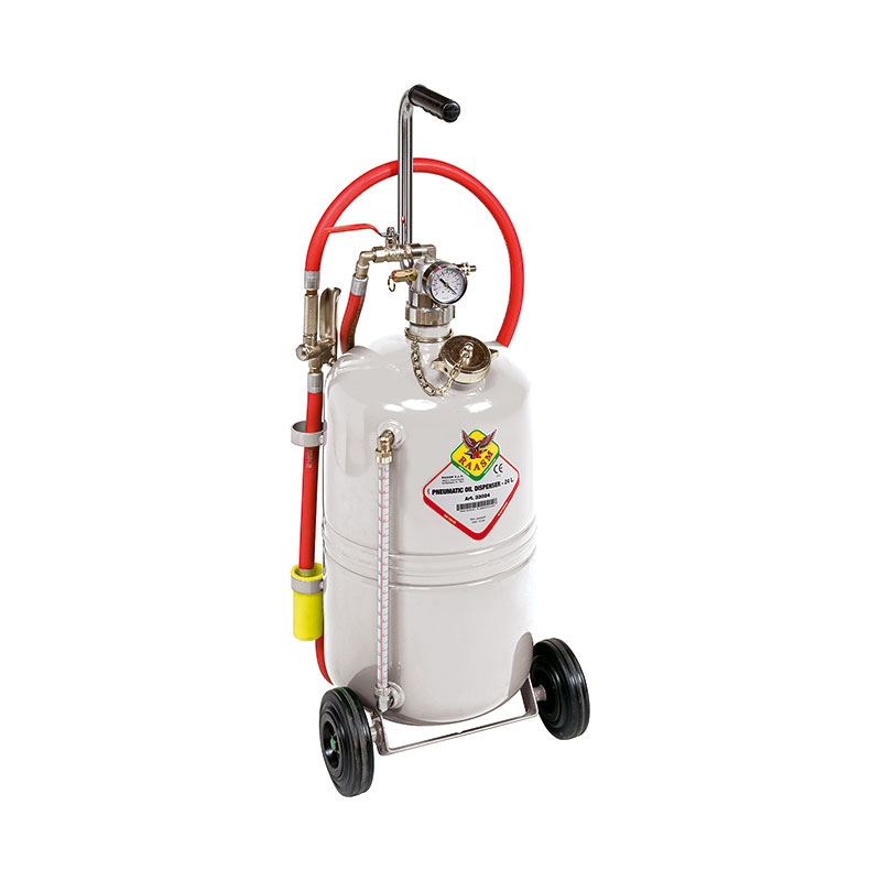 Установка для раздачи масла пневматическая RAASM 33024/C1 предназначена для масел с высокой вязкостью (максимальная плотность – SAE 130). Установка представляет собой компактное и простое в эксплуатации переносное устройство, оснащенное резервуаром ёмкостью 24 литра, пневматическим насосом, предохранительным клапаном, манометром, показателем уровня, шлангом длиной 2 метра и пистолетом с гибким наконечником. После того как установка будет заполнена на 4/5 ёмкости, и помещена под давление 6-8 бар, она будет работать самостоятельно, нет необходимости в постоянном подключении к сети сжатого воздуха. Установка поставляется с ручкой и колесами для транспортировки. В комплект входит воронка с защитой от оттока на краях. Цвет RAL 7040 (серый).